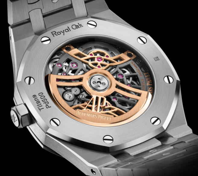 Avec un diamètre de 41 mm et une épaisseur de seulement 9,5 mm, le boîtier impressionne par son équilibre. Il s’agit d’un calendrier perpétuel plus fin et sensiblement plus portable que les précédentes Royal Oak QP squelettées, notamment la référence 26585. La construction associe le titane léger au verre métallique massif (Bulk Metallic Glass – BMG) propriétaire d’AP, utilisé pour la lunette, le cadre du fond de boîte et les maillons du bracelet, déjà aperçu sur la QP du 150ᵉ anniversaire, réf. 26585XT. Le titane satiné contraste avec les reflets miroir du BMG, à l’éclat presque liquide ; l’ensemble dégage une impression à la fois précieuse et technique.