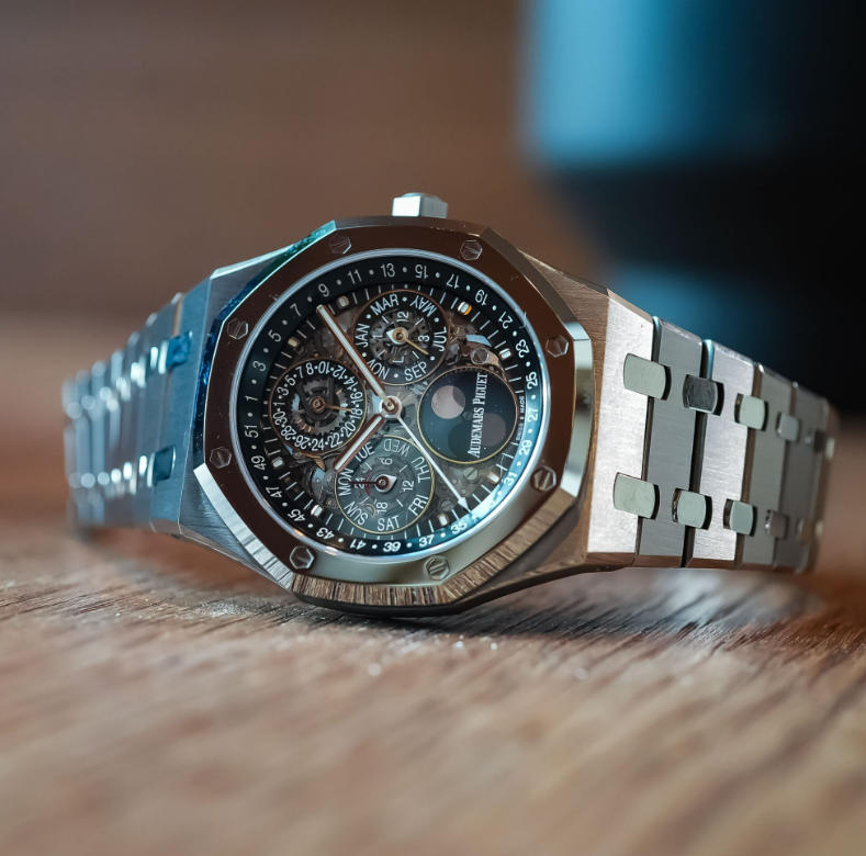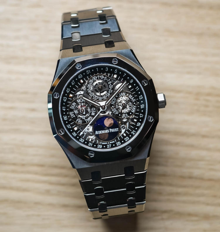 Au théâtre, les spectacles expérimentaux évoluent souvent sur une ligne fine entre le spectaculaire et la confusion ; il en va de même pour les calendriers perpétuels squelettés. Ici, AP trouve l’équilibre presque parfait. Le cadran en saphir dévoile le calibre 7139 tout en conservant une lisibilité étonnamment bonne. La profondeur visuelle est agréable ; les compteurs fumés sur les bords, dédiés aux indications du calendrier, semblent flotter au-dessus du mouvement sans s’y fondre.